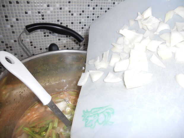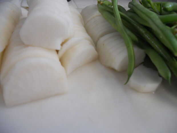Hay una orden para poner los ingredientes en la olla, simplemente porque las cosas tardan un poco más en cocinarse. En primer lugar, mezcle el polvo de la Base de la sopa en el agua y ajuste la estufa a una temperatura alta. A continuación añadir el rábano daikon en rodajas y judías verdes. Asegúrese de lavar y pelar mi daikon antes de cortar y ajustar mis judías verdes en trozos pequeños. Intento usar judías verdes chinos, pero sólo puedo conseguir mis manos en judías verdes a veces. Las judías verdes hacen la sopa huele un poco torpe, que mis compañeros dicen que huele a pedos. ¡ Bueno!