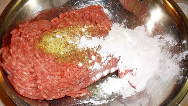 Mezclar la carne molida con harina de tapioca y condimentos, luego procesar en licuadora/batidora en una pasta fina. Mientras que procesa, agregue cubos de hielo y aceite vegetal (para que tu licuadora/procesador debe ser el que es capaz de triturar hielo - esto es para asegurarse de que su motor no será demasiado caliente y sería gran resultado para las albóndigas). Esto se puede hacer en etapas en vez de eso toda carne como uno (dependiendo del tamaño de su procesador de alimentos)
