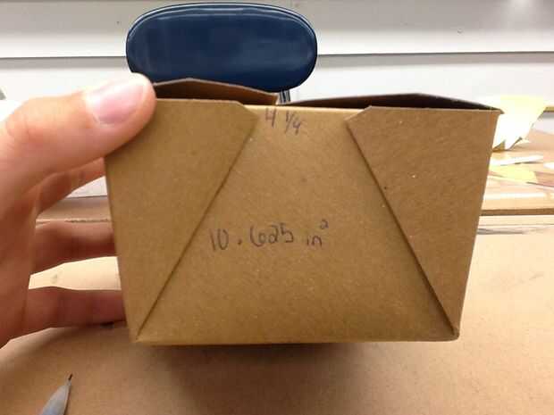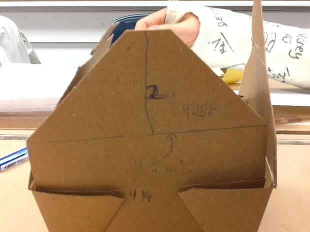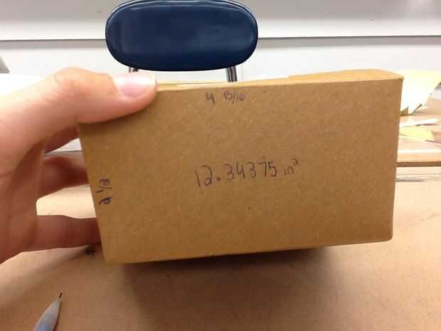 Del mismo modo para el volumen, debe medir la base y la altura, pero como vamos a la anchura. Para encontrar el volumen de la figura original, se debe utilizar la ecuación BxHxW (base x altura x ancho). Para nuestra caja fue formado como un triángulo rectangular, así que tuvimos que utilizar figuras similares para encontrar nuestro volumen.