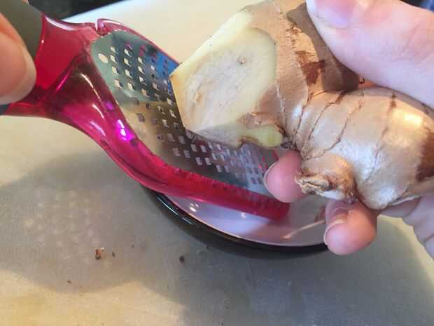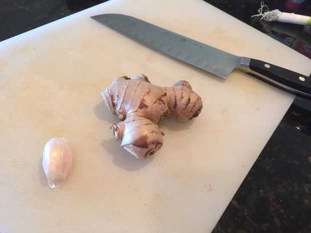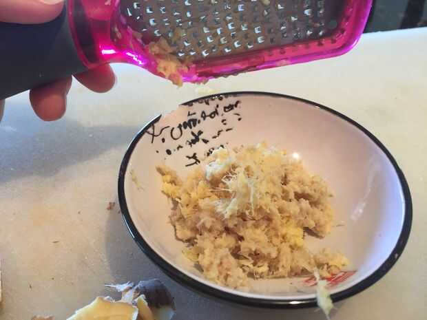 Lo más importante de la salsa teriyaki es utilizar jengibre recién rallado! Puede usar jengibre enlatada pero si quieres el mejor sabor tienes que rallar tú mismo! Primero pelar la raíz de jengibre fresca y rallarlo hasta que tenga aproximadamente 1 1/2 cucharadas de la misma, coloque a un lado. Luego pelar y picar el ajo en un lugar así a un lado y el prensa ajos.