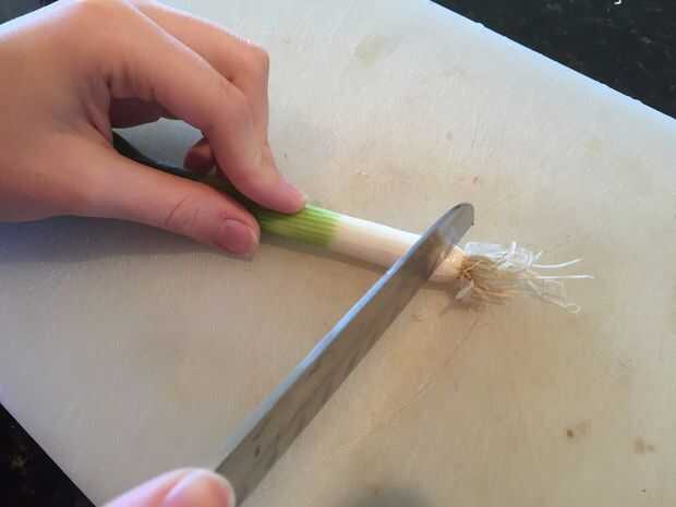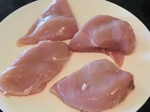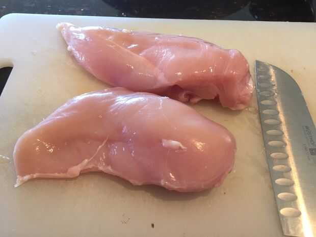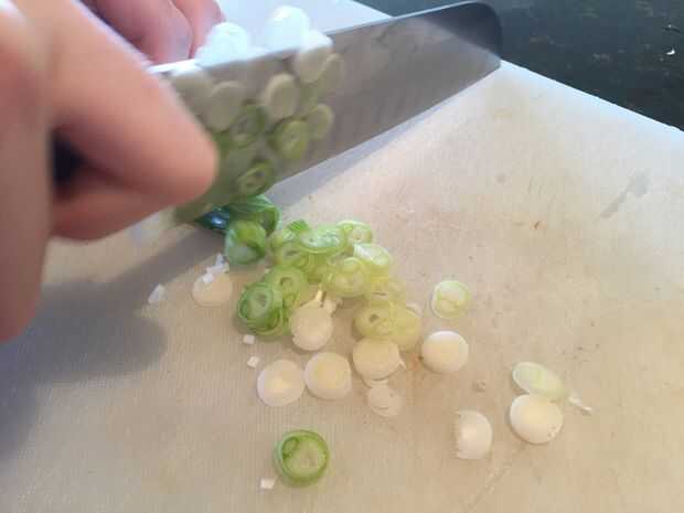 Luego corte cada pechuga de pollo por la mitad para que tengas un total de 4 piezas. Entonces finalmente cortar la cebolleta (trata de no machacar la cebolla mediante un cuchillo porque machacar la cebolla le dará una textura viscosa.)