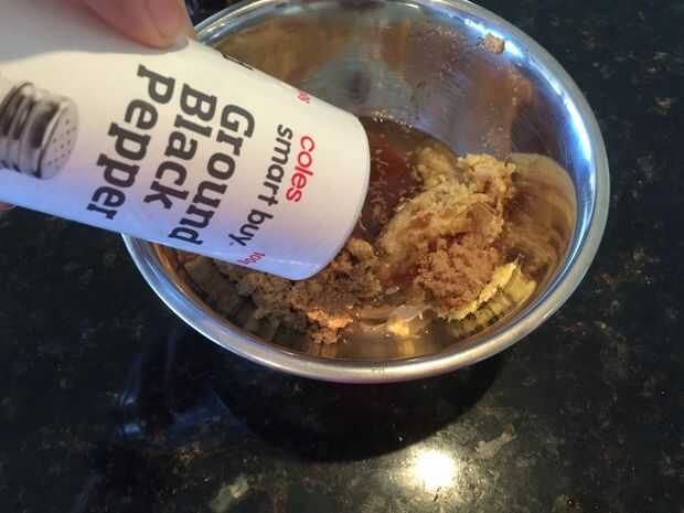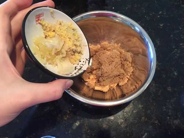 En el tazón mediano agregue la azúcar morena, salsa de soja, mirin, pimienta negra, jengibre y ajo y mezclar. Este es el punto donde usted puede ajustar el sabor a su gusto.