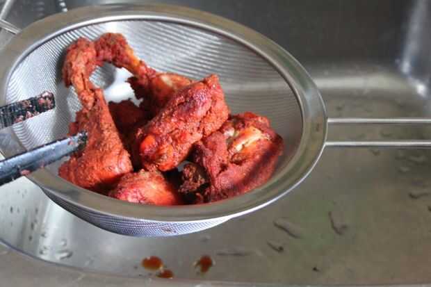 Una vez terminado se pone el pollo junta las piezas en un colador, para que las gotas de agua entera.