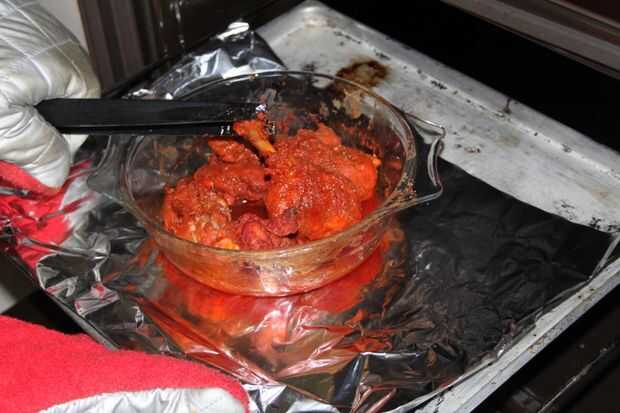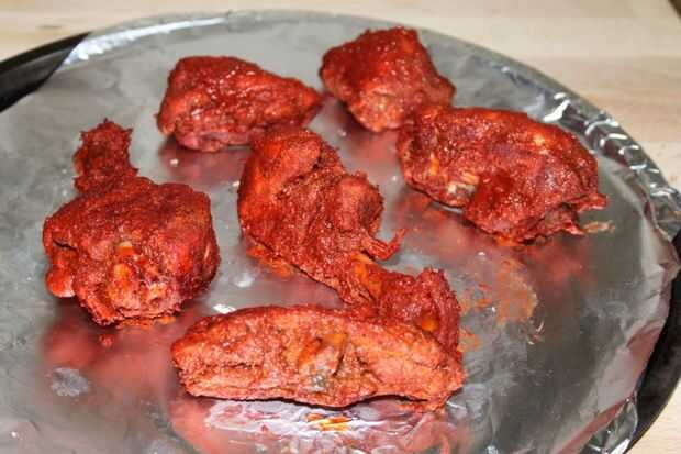 Cuando esté seco volver a aplicar la pasta de equilibrio sobre los trozos de pollo y colocarlo en la bandeja para hornear.