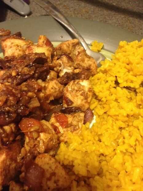 Recorte pollo, cortado en pequeños cubos-mezcla todos los ingredientes de adobo e incorpore al pollo. Marinar por lo menos 15 minutos,