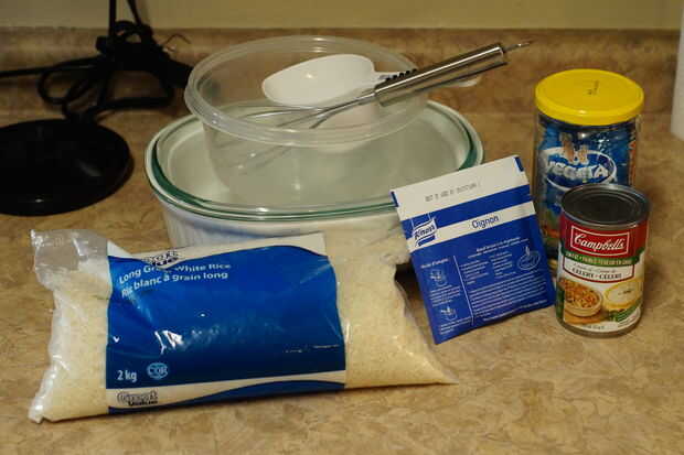 Aparatos necesitados: un tazón microondas, sartén, un par de pinzas y un tenedor de tamaño de un mediano.Ingredientes necesarios: 2 tazas de pollo asado, desmenuzado queso, aceite de oliva extra virgen, 1 taza de arroz blanco del minuto, 3/4 taza de