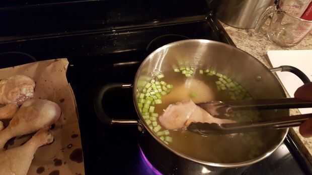 Una vez que ha escurrido el pollo, colóquelo con cuidado en la olla. Si la olla no es hirviendo suavemente aumentar un poco el calor.
