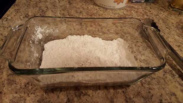 Tomar un tazón, vierta aproximadamente 1 taza de harina, una pizca de sal y pimienta al gusto.