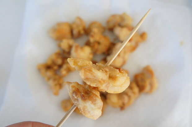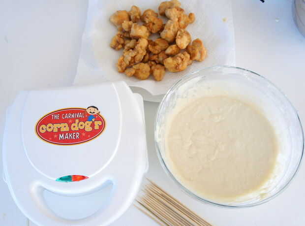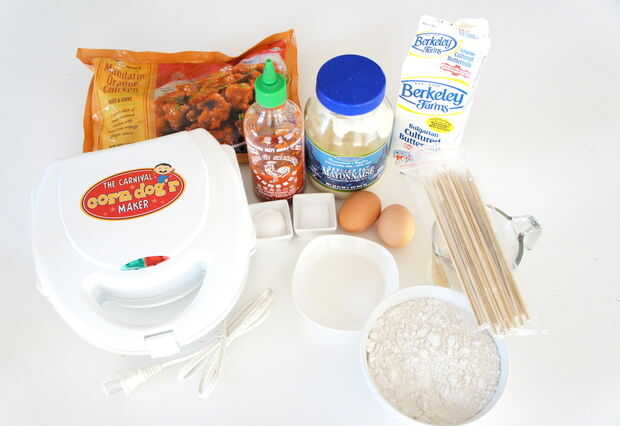 Rociar la máquina con spray y pre-heat. También puede cepillar la máquina con aceite para evitar que se pegue. Use un cepillo de silicona si usted elige este método. Tendrá que recortar algunos de los bordes de la gallina, por lo que caben en la la fábrica de perro de maíz. Trozos de pollo en cada palillo en pincho 3 o 4.