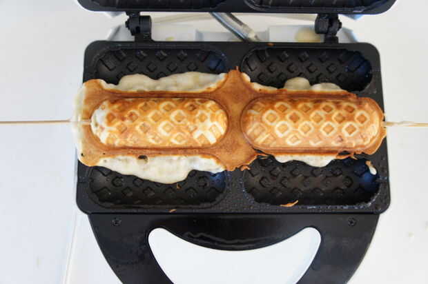 Cerca de la máquina y espere hasta que la luz verde indica que están listos. Tarda unos 3-5 minutos para conseguir el primer lote de gofres doradas. Puede abrir la tapa de la máquina y verificar el color de los barquillos. Si no son de color dorado, cierre la máquina y esperar un mínimo de 2 adicionales repiten hasta lograr el color deseado en galleta. Recortar los bordes de la galleta.