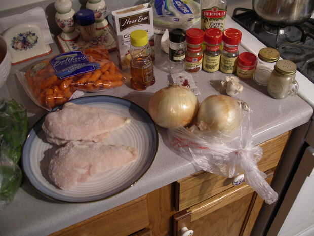 zanahoria y tomate receta de estofado de pollo:2 zanahorias grandes (cortadas)tsps 1,5. aceite de oliva1 cebolla pequeña (cortada)1 lata de tomate (yo no usé sal añadida)1.5 tazas en dados la pechuga de pollo cocinada2 tazas de caldo de polloalmidón