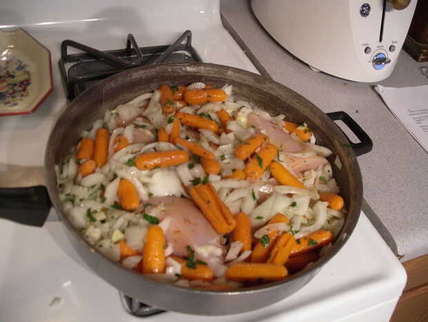 Si te olvidas de esperar para poner las cosas en después de la 1/2 hora, no es un desastre, te resultan bien, generalmente sólo esperar a que ponga en la mitad de las zanahorias, la canela y la miel. La receta dice que use sólo 1/2 una taza de agua pero a veces eso no es suficiente para mantener húmedo el pollo, experimentar y utilizar su juicio.