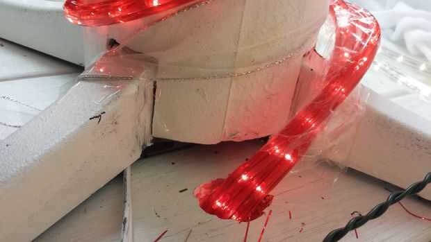 Con 2 luces de la cuerda roja de 15 pies, colocamos el diseño para el poste. La luz de la cuerda viene con abrazaderas que enrosque en el tubo de cartón. Después de pintar el tubo, el tubo se hizo más sólido y hecho atornillar los clips en incluso más fácil.
