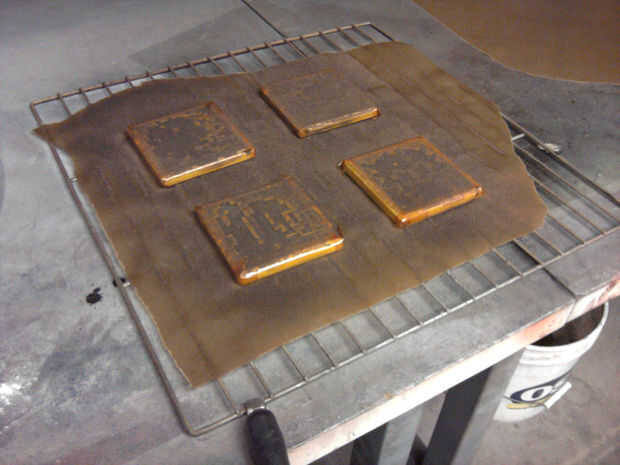 Primero, configurar una parrilla de acero del horno y adjunto mi capa del polvo de puesta a tierra cable directamente a él. Encima de la rejilla del horno, añadí un pedazo de papel encerado para que la capa del polvo no se pegue a la rejilla sí mismo. Finalmente en la parte superior el papel de cera, coloqué mis azulejos. Para aquellos familiarizados con el proceso, no hice ningún tratamiento previo del azulejo alguno - ninguna limpieza, sin desgasificar. Luego cargado pistola de polvo con un polvo de cobre vena de recubrimientos de Columbiay tienes que rociar con un 10, 000V sesgo. ¿El costo de 1 libra de polvo? cerca de $15. ¿La cantidad que utiliza para este proyecto? Quizás 1/10 de libra. Esta es la otra razón por qué rocas de la capa del polvo - hay uso tan poco material y su tan barato!
