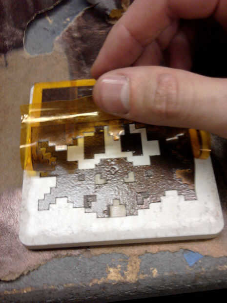 Después de pasar 15 minutos en el horno tostador, los azulejos se retirar y dejar enfriar 2-3 minutos. En este punto, tengo que quitar el masking. Quitar las máscaras mientras que los azulejos son todavía caliente le da mucho mejor los bordes una vez que todos la máscara se ha ido como opusieron a permitiendo que los azulejos se enfríe por completo.