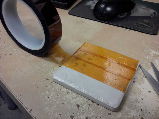 ¡ Pero espere! Antes de agarrar que azul cinta de pintores de su armario, no te olvides que polvo recubrimiento se realiza en un horno a aproximadamente 400-450F. A esta temperatura, prácticamente cada cinta que existe se quema o derrite. Cojos. Oh espera... excepto uno: Kapton! Kapton es ese oro que se utilizó en el exterior de la lander lunar y es super resistente al calor y casi impermeables a la radiación. ¡ Genial! Mejor aún, sus productos de descomposición son sólo monóxido de carbono y dióxido de carbono, por lo que es totalmente seguro en láser - no daño al equipo, no gasear a la habitación.