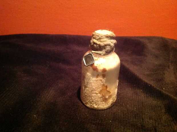 Para esto visualizó una serpiente tiene su veneno extraído en un frasco y cómo podrían ser esas gotas. Terminé mina llena de harina y brillo para simular el polvo de "zombie" de Voodoo.