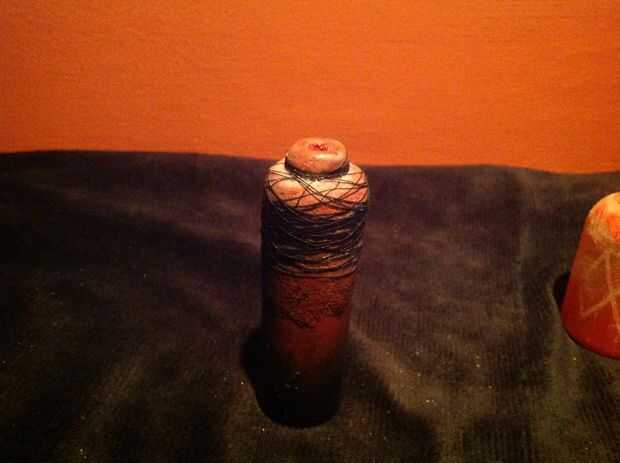 - Antes de que la cera se endurece, toma algún hilo negro y el viento en la parte superior irregularmente. Cepillo mediano más encáustica sobre el hilo para asegurarse de que está adherido a la botella.