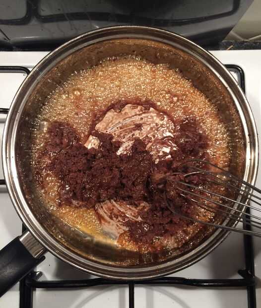 Cuando los lados del azúcar empiezan a dorarse, añadir el chocolate.
