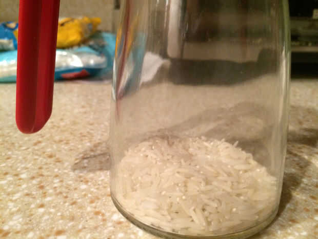 Primero agregue suficiente arroz para cubrir la parte inferior de la coctelera. Esto ayudará con el polvo de agrupar de la humedad.