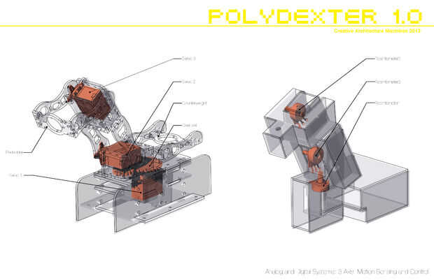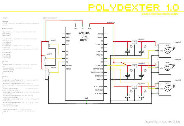 El cableado de Polydexter es bastante simple. La parte más complicada del proceso vino en que requieren los reguladores para los motores de servo MG995 que vinieron con nuestros kits. Si usted tiene servos que pueden ser alimentados por un convertidor de corriente de 5V sencilla puede omitir los reguladores. Pedimos disculpas por nuestro cableado desordenado y protoboard. En nuestra defensa, fue nuestro primer proyecto y soldar los cables a los potenciómetros era la medida de nuestras capacidades en el tiempo.