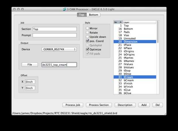 Si usas EAGLE, he creado un archivo de trabajo de la CAM e incluye manual de instrucciones. Si utiliza otro software de PCB, generar un archivo GERBER con la dimensión capa y capa de crema.