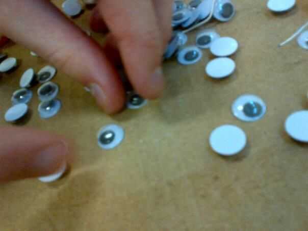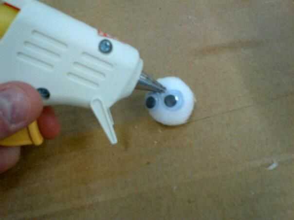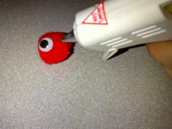 Tomar dos ojos saltones, tomar la pistola de pegamento caliente y pegamento en el centro de la pom pom.