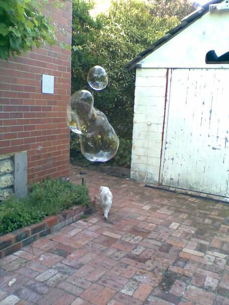 la mejor manera de hacerlo es caminar con él, o dejar que el viento lo haga por usted. Recuerde sacar la cadena por lo que no es ningún agujero en el bucle para empezar luego abra lentamente el lazo para hacer burbujas grandes. También para separar la burbuja simple cerrar el ciclo.