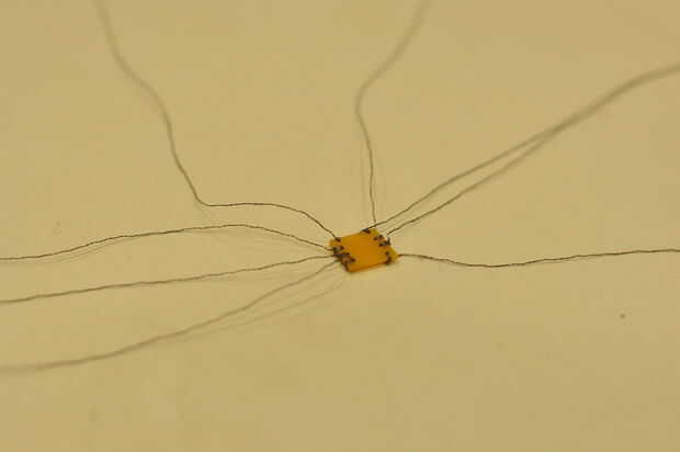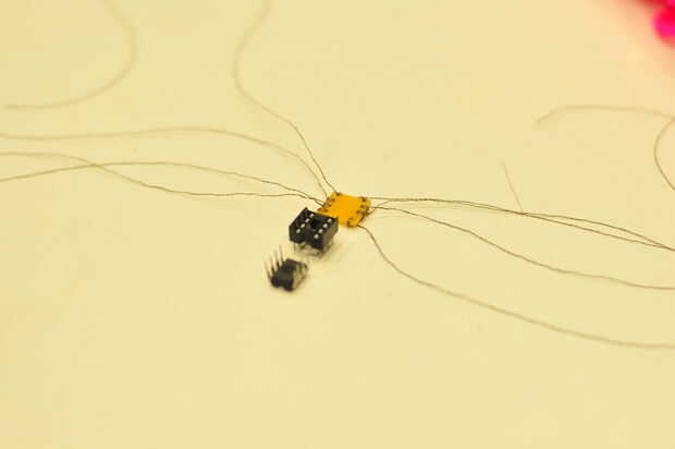 En primer lugar, necesitamos una base para el montaje de los pernos de la viruta (ATTiny en las fotos). Vamos a utilizar tablero perforado con hilo conductor y un chip con ocho pernos.