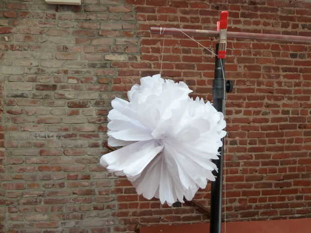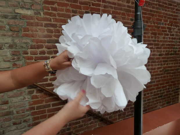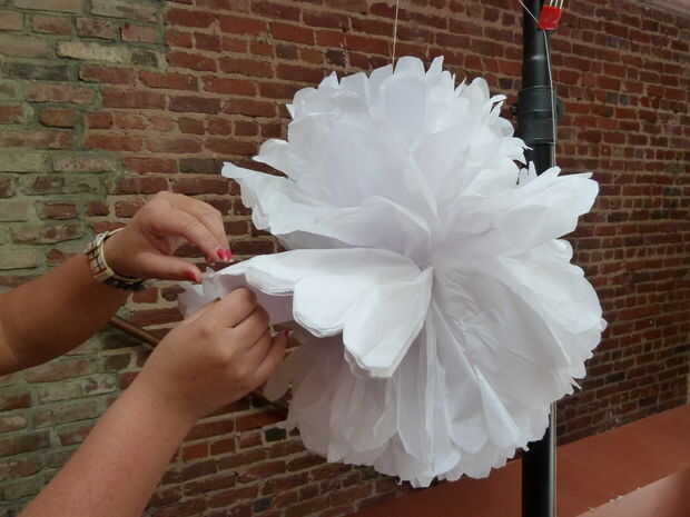 Me parece que mis brazos se cansan porque no tengo ningún músculo. Así que me gustaría encontrar una puerta, o algo que puedo colgar los pompones en y terminar la otra mitad. Usted no quiere poner en una mesa porque podría aplastar el papel...
