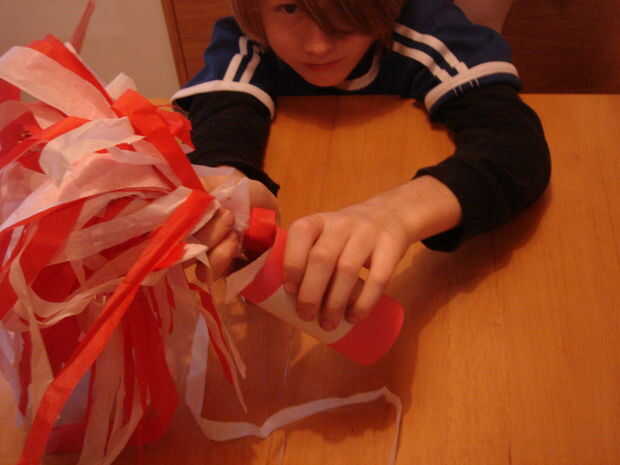 Pompones hechos en casa para que pueda obtener ánimo de yer en el Super Bowl el domingo (4 / 6 paso)