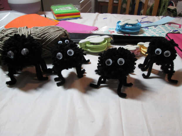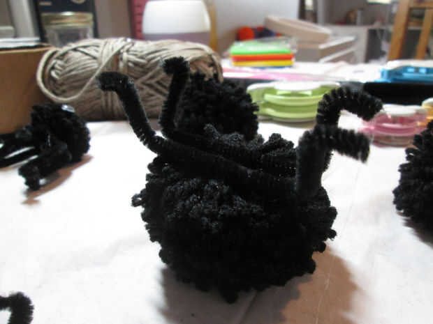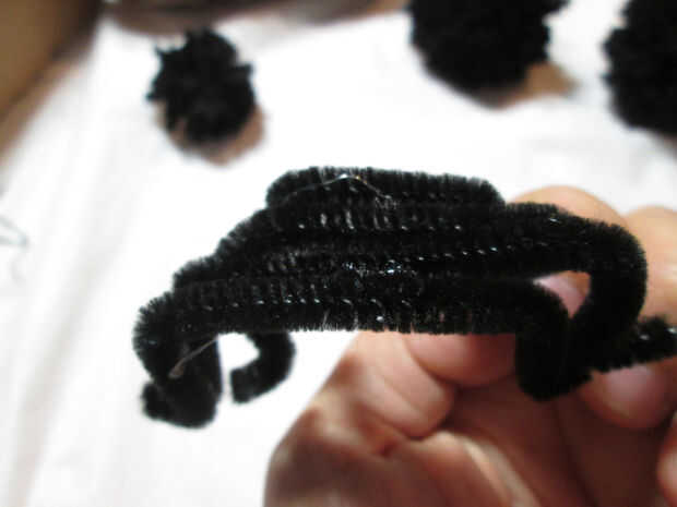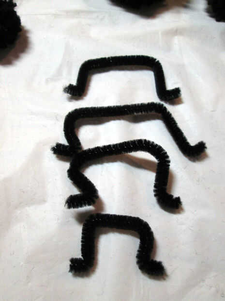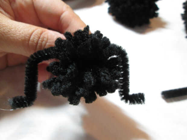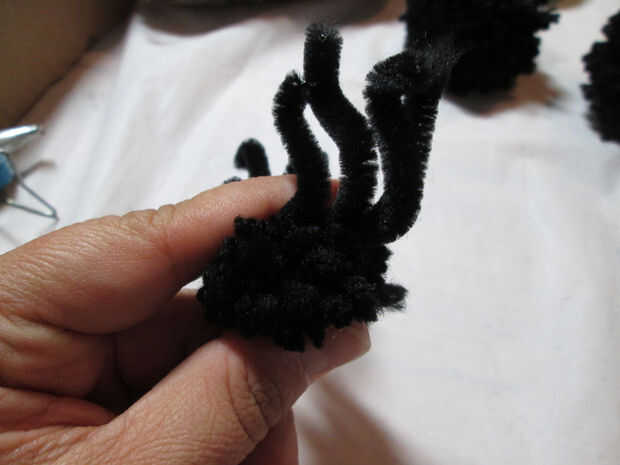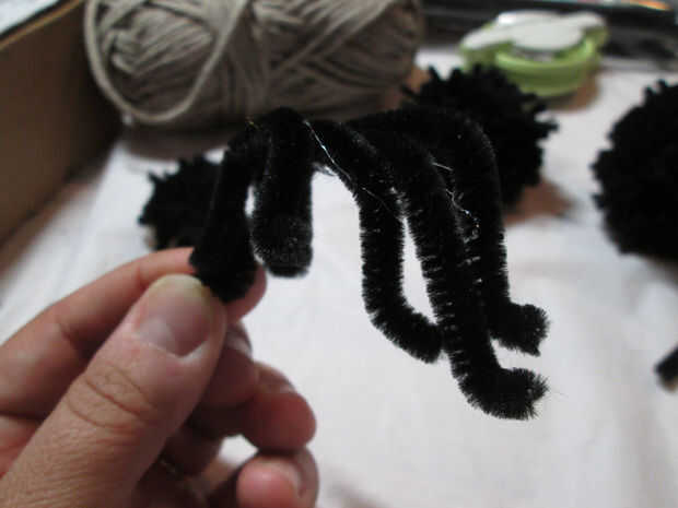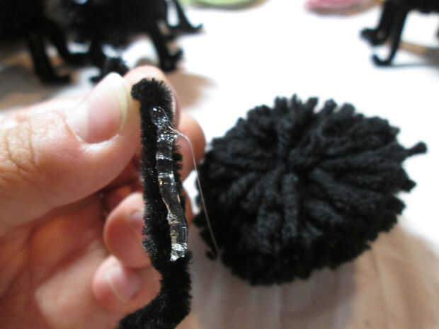 Una vez que las patas de la araña fueron dobladas en forma, tomé cuatro pares y pegado juntos para colocar en los pompones más pequeños usando la pistola encoladora.