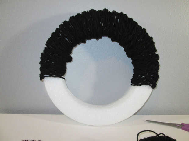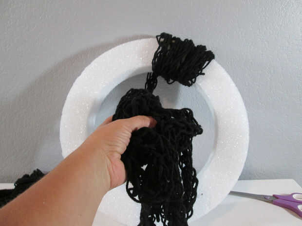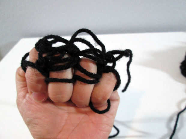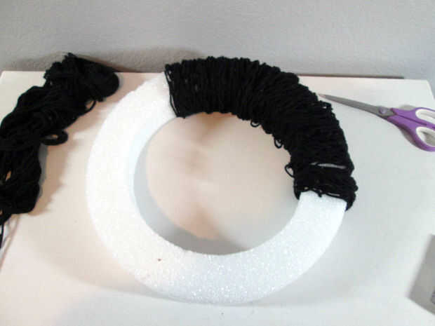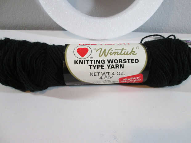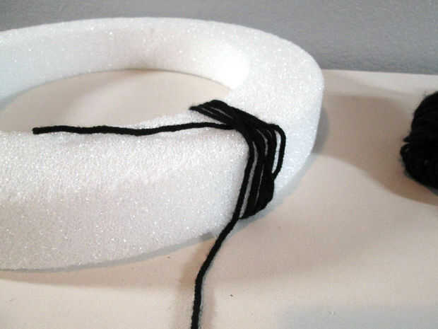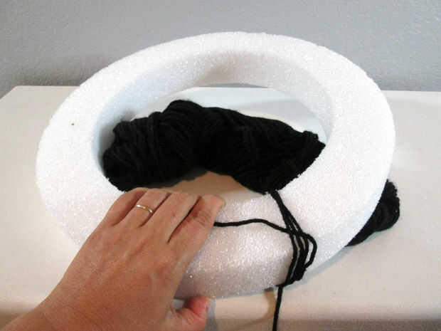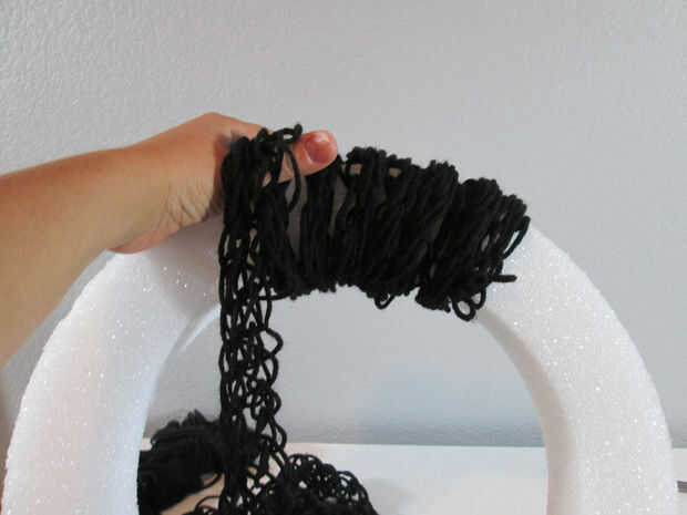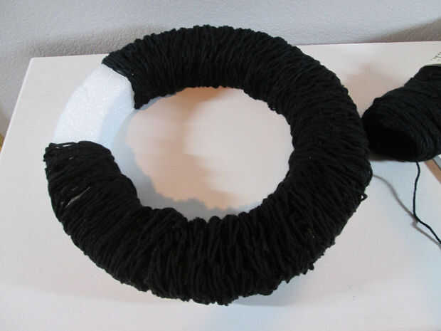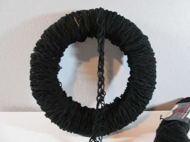 Elegí a dedo punto tres cadenas de hilado de acrílico negro de largo y envuelven la corona en las cadenas. El hacer punto del dedo tomó alrededor de una hora de total, mientras que sólo puedo imaginar cuánto habría tomado me Envuelva un solo filamento (o incluso dos hebras a la vez) de hilo alrededor de la corona de base.