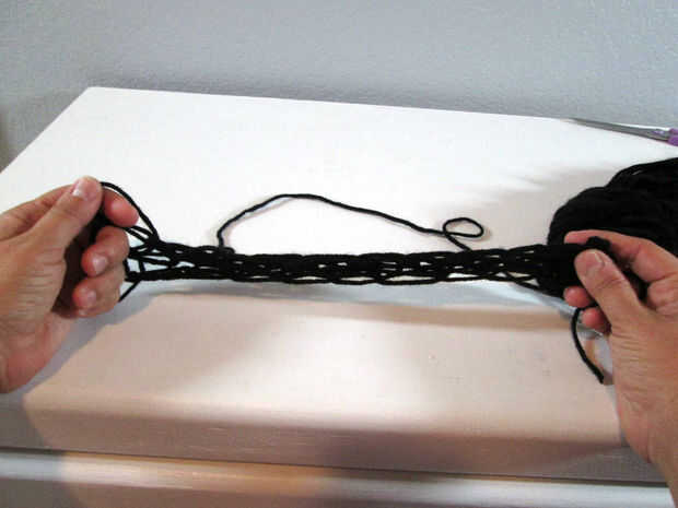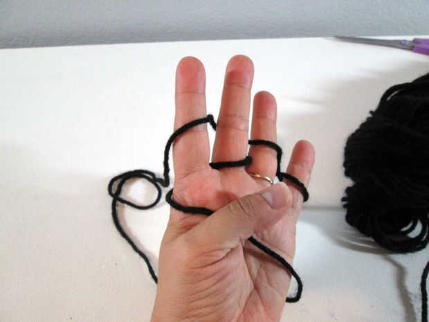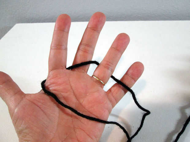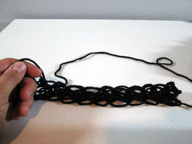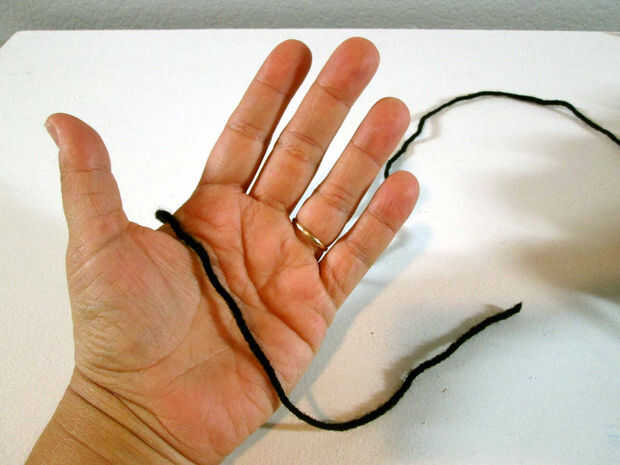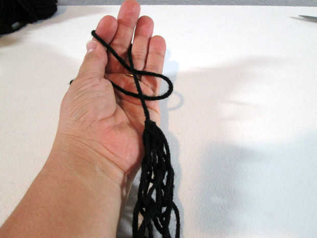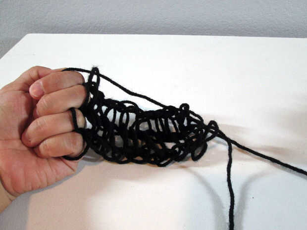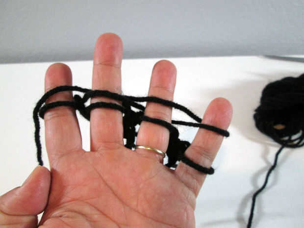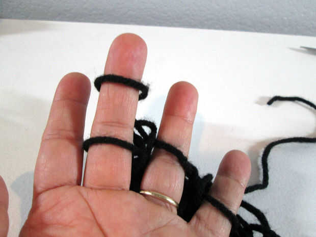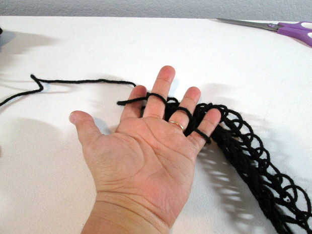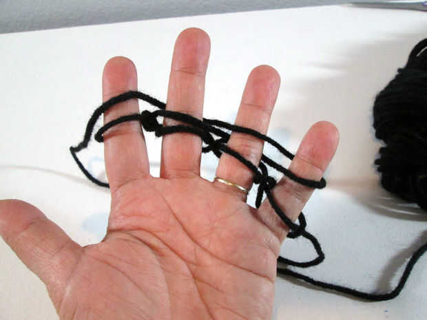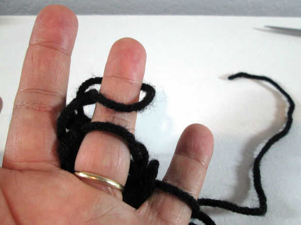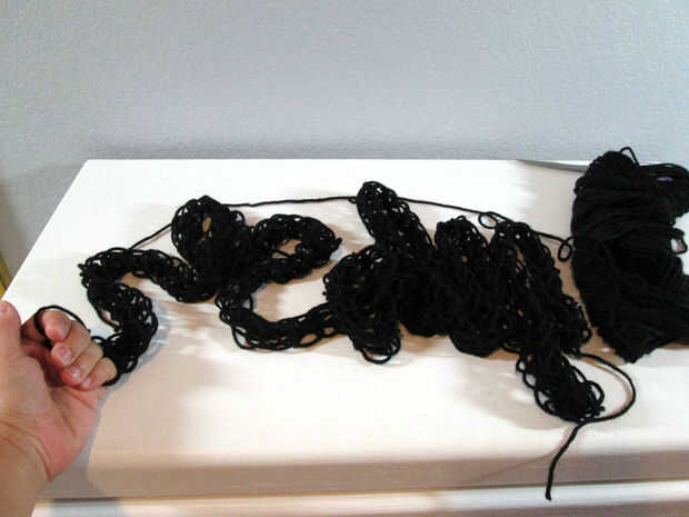 Los tutoriales de hacer punto del dedo se ligan abajo. Terminé usando sobre una madeja entera de hilo negro, y no estoy seguro de la longitud exacta de cadenas o yardas de hilado.