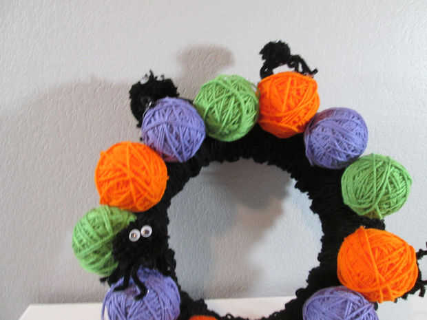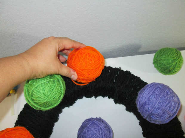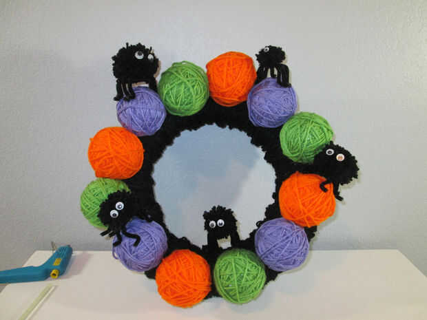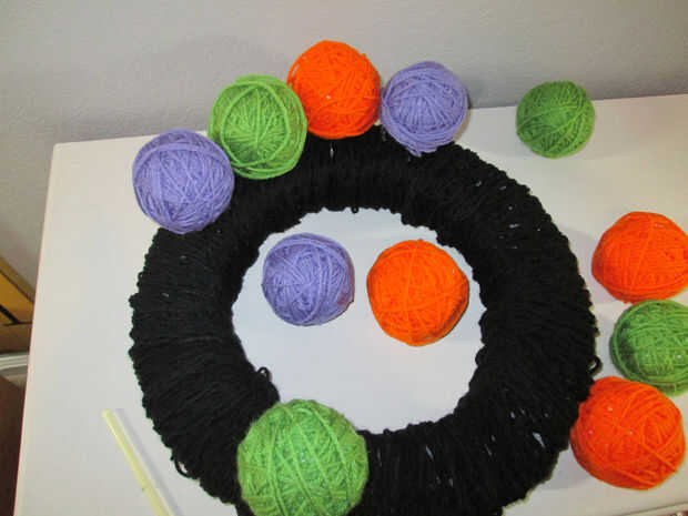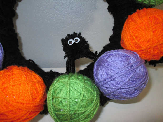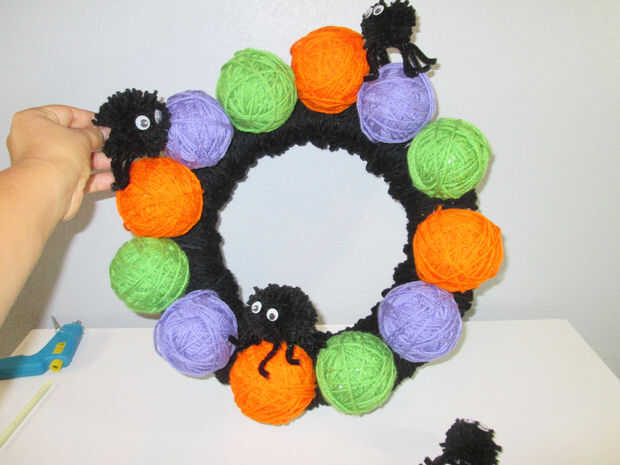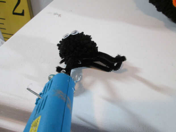 Entonces llené en los agujeros con el poms de la araña, pegadas como al azar como sea posible. Quería cinco arañas (ya que hay cinco en nuestra familia) ya que es un número impar que me han dicho es un aspecto atractivo de los acuerdos.
