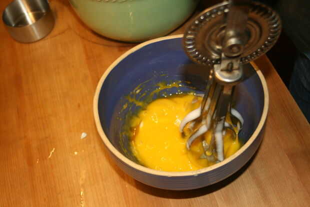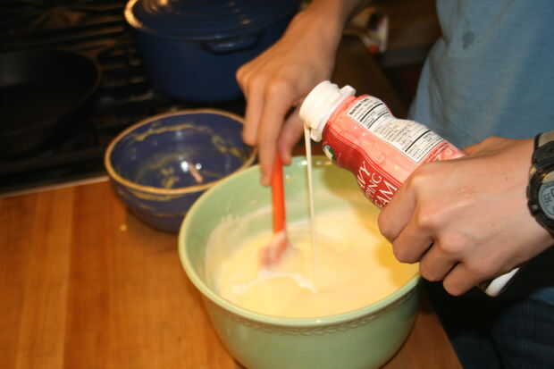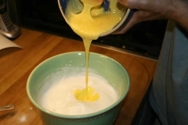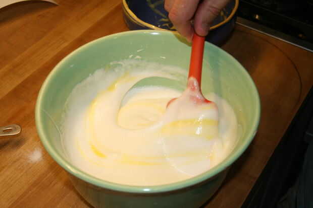 Vierta la mezcla de yema de huevo en la mezcla de blanco (que está bien hacerlo ahora, ya que los blancos han mullida)