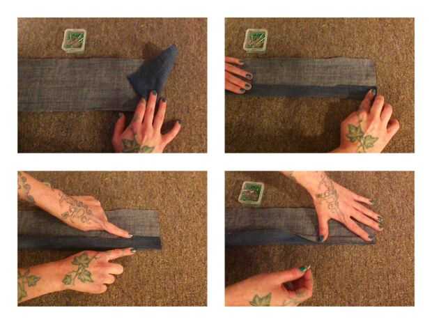 A continuación establecer tela (Asegúrese de que el interior de su jean está boca arriba). A partir de cualquier lado que vas a doblar aproximadamente una pulgada de la tela en sí mismo. Doblar otra vez una vez más hasta que con a sus bordes. El perno en su lugar.