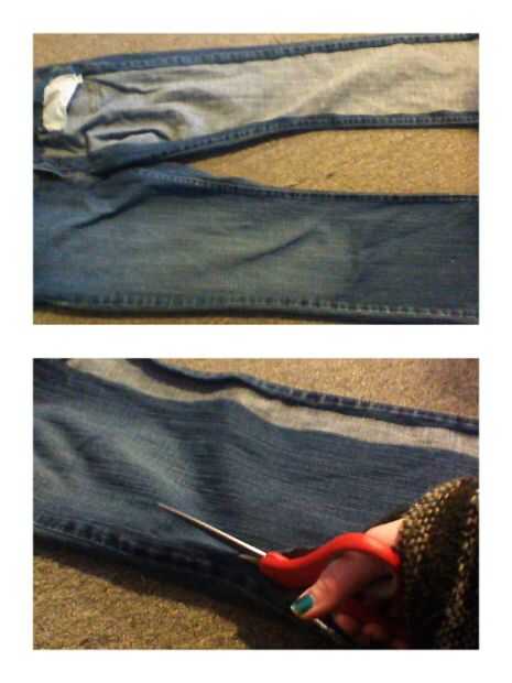 Con su chatarra jeans puestos plano cortan la cara de los pantalones desde el dobladillo hasta el bolsillo delantero. Objetivo de cerca de 35 pulgadas de largo y cinco a seis pulgadas de ancho. No tiene que ser exacto pero ayuda agradables líneas rectas.