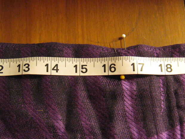 Doble la tela por la mitad longitudinalmente. Medida 16 pulgadas del centro y del pin. Continuar hacia los extremos del perno de la marca de 16 pulgadas. Cosa de 16 pulgadas marca todo el camino hasta el final.