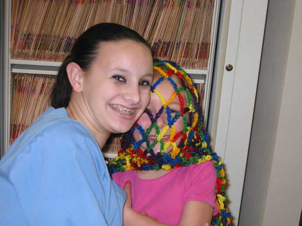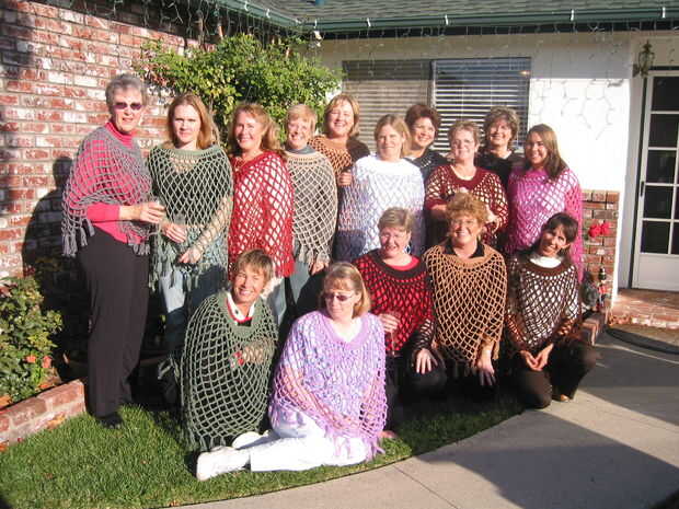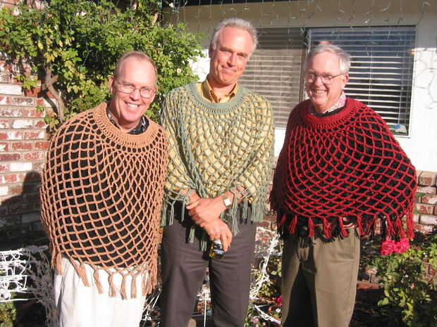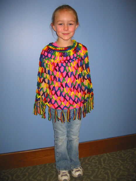 primero aprendí a hacer ganchillo hace 38 años cuando estaba embarazada de mi hijo. Poco después de nacer, he encontrado este patrón de un poncho de tejido abierto y en ese momento, hice innumerables ponchos para familia y amigos. El patrón original fue para un adulto, pero era fácil para mí cambiar a un niño. He hecho varios ponchos generacionales desde entonces. Mis hermanas, primos y sus hijas. Mi hijo solía llamarlos los ponchos neto de baloncesto. No había usado el patrón en un tiempo, luego mi jefe tiene una hija que estaba queriendo un poncho al desgaste. Me ofrecí como voluntaria hacer uno y el resultado es en la primera foto. Los niños realmente parecen que les gusta solo para jugar con. No realmente deberían para protección contra la intemperie, aunque proporcionan un poco de calor. Son más un elemento decorativo. Los niños dicen que se sienten como alas. Hace dos años, hice uno de mis compañeros de trabajo en otra oficina dental en que trabajo. Fue muy divertido para mí cuando llevaban en nuestro almuerzo anual de Navidad (junto a la última foto). Incluso subimos los dentistas la diversión (última foto). Se puede hacer en un día, usando sólo una madeja de 6 onzas de hilado de 4 capas. A veces hago el cuello y la franja en otro color como se muestra en algunas fotos, pero por lo general en todos los colores. Generalmente uso común oficio de 4 capas de hilo, pero ha pensado en usar un más costoso, hilado de la especialidad. Es fácil y divertido.