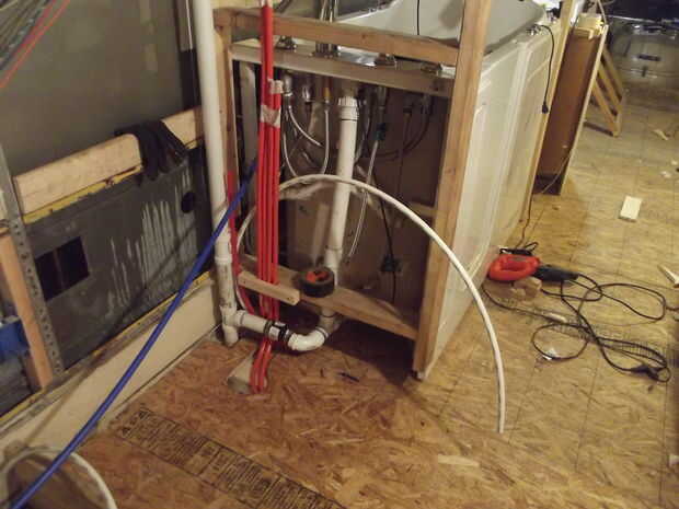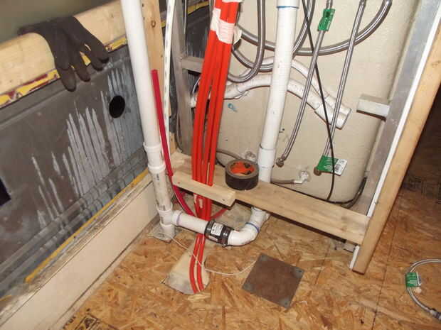 Aquí es donde la tubería sube por el piso. Se trata de (a diferencia de la versión europea) mi retrete. Contará con todos los controles de agua para el autobús entero incluyendo un calentador de agua sin tanque.