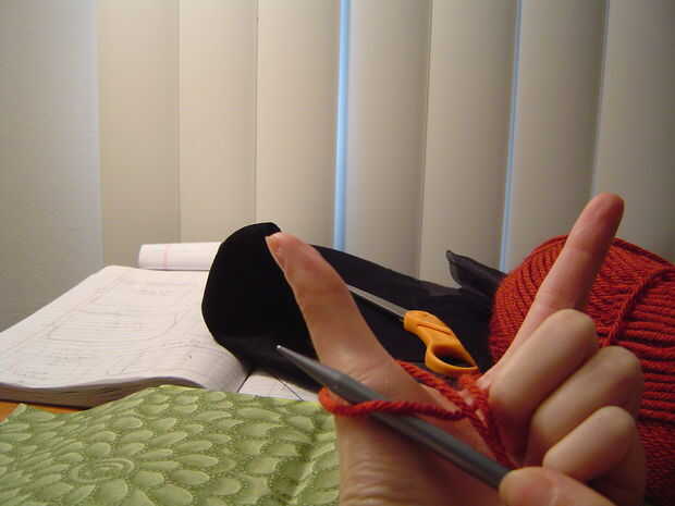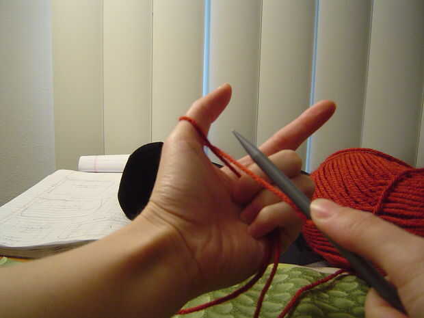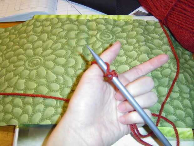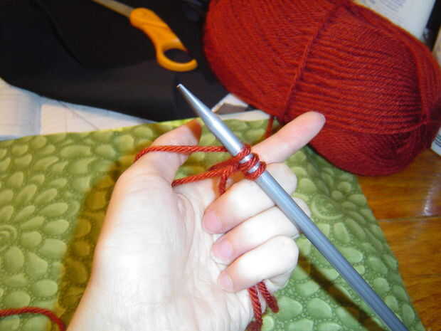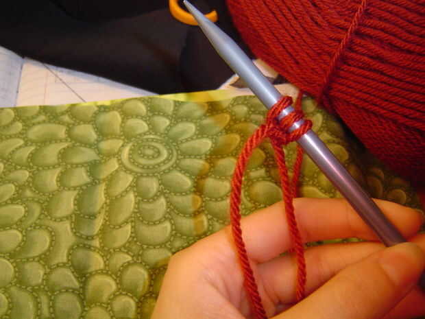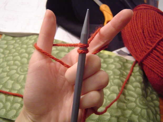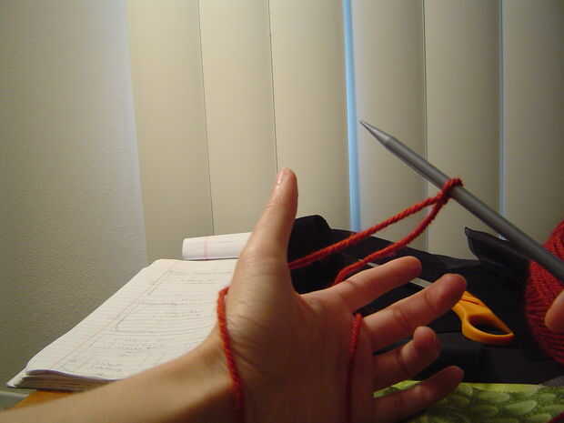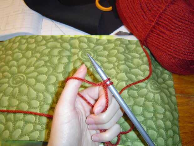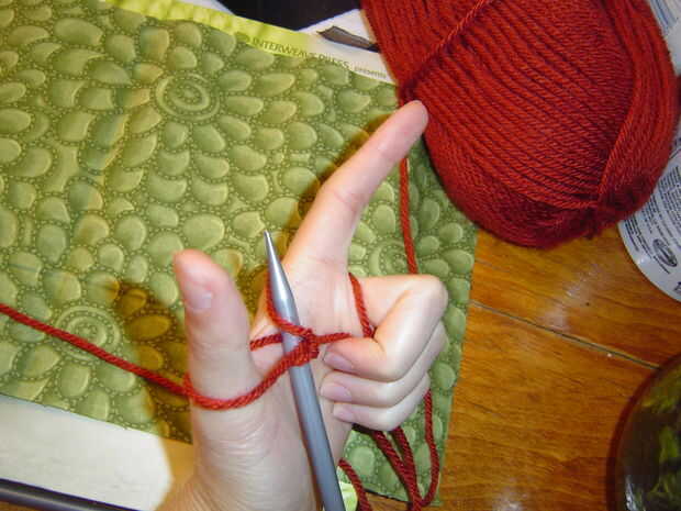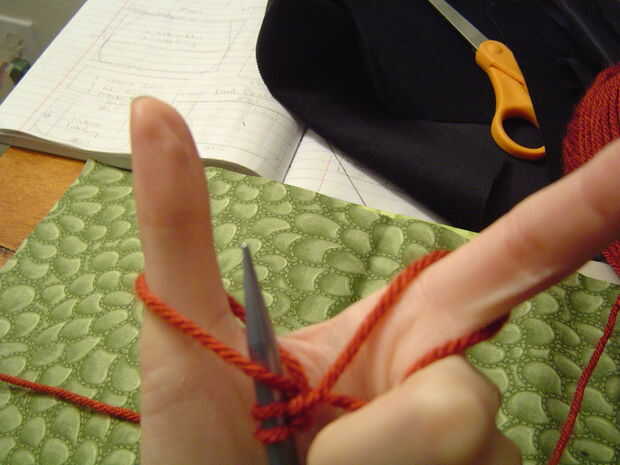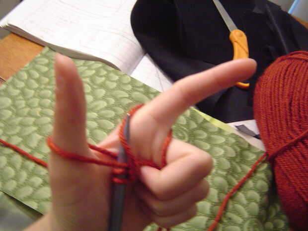 Imagine el hilo colgando de la parte delantera y trasera de las agujas es un arco. Juntar el pulgar y el índice e imaginar que son un error. Ahora, meter la cabeza de insecto por el arco.
