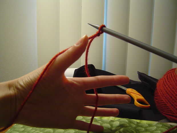 Aferrándose a su nudo deslizante con el dedo derecho, baje la aguja para que pueda ver un lazo alrededor de su dedo pulgar y un lazo alrededor de su foreringer. De izquierda a derecha, hay cuatro secciones verticales del hilado que comprende estos lazos. Aras de la claridad, a numero 1-4 de izquierda a derecha.