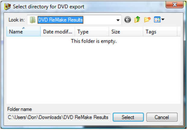 7. Si desea crear un tu propio menú de intro, luego ir al paso que sigue, "paso 5: (paso opcional) construir un menú de inicio personalizado para DVD". Si desea utilizar el menú por defecto, entonces puede crear los nuevos archivos de DVD seleccionando "Archivo", "Exportar DVD..." y confirmar la ruta de acceso a la carpeta dentro de "DVD ReMake resultados" llamadas "VIDEO_TS" y presione "Select." (séptima foto)