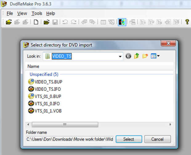 1. Abra el DvdReMake Pro y seleccione "Archivo", "DVD de importación" y desplácese a la primera carpeta de la película "formato de pantalla ancha." Seleccione la carpeta "Video_TS" (véase abajo) y deje que DvdReMake Pro hacer la importación. Repita este proceso con la carpeta de "Formato de TV estándar". (primera foto)