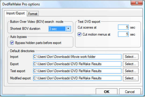 3. a continuación, necesitamos decirle a DvdReMake Pro dónde colocar los resultados durante el proceso de fusión. Seleccione "Herramientas", "Opciones" y seleccione las carpetas correspondientes. Asignar todos cuatro campos, "Importar", "Export", "Exportación de prueba" y "Exportación modificado." (tercera foto)