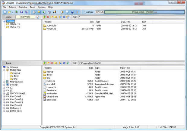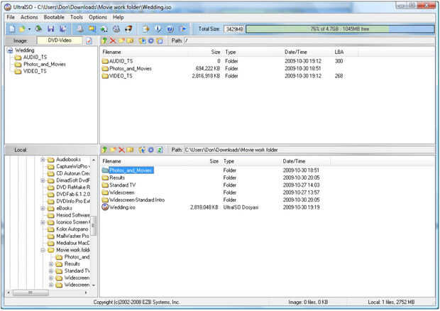 3. ahora abre el UltraISO y vaya a la "carpeta de trabajo la película" y seleccione el archivo que acaba de crear, "boda - raw.iso" en este ejemplo. (tercera foto)