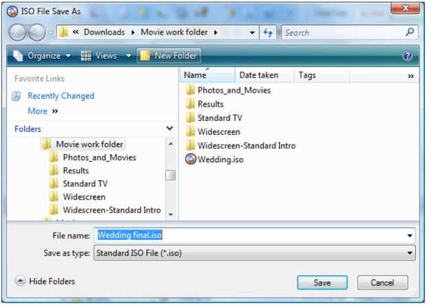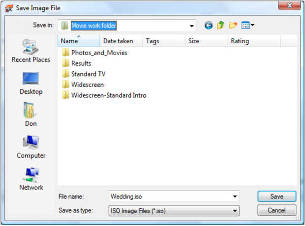 2. Cuando aparezca la ventana de "Guardar archivo de imagen", establecen el "guardar como tipo" como "ISO archivos de imagen (*.iso)", escriba un nombre de archivo apropiado (algo así como "Wedding - raw.iso"), vaya a su "carpeta de trabajo la película" y seleccione "Guardar". (segunda foto)