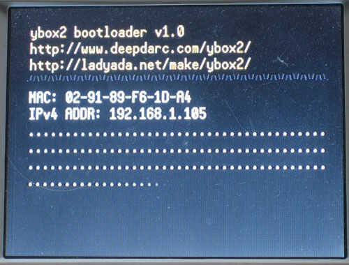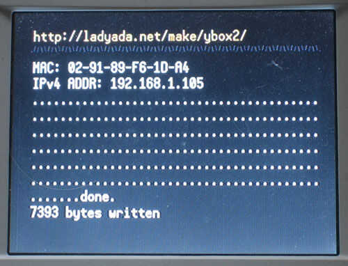 Donde thingnumber1 es la dirección IP de su Ybox y thingnumber2.binary es el nombre del widget que desea subir. Deberán parpadear algunas luces, algunos puntos deben destellar en la pantalla y luego su terminal va a decir 'Hecho' y algunos otros basura. Esto significa que el Ybox tiene ahora su widget.