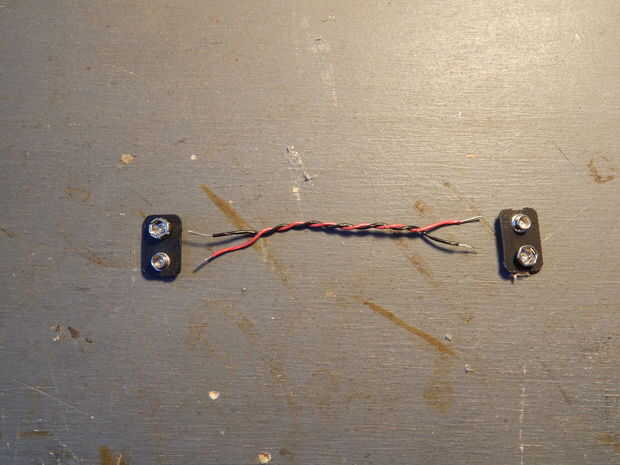 Para nuestro uso ponemos 2 clips en el alambre.  Un detalle es que es conectar el cable positivo a diferentes partes del clip en los dos extremos.  Esto es para asegurarse de que la polaridad se entrega en el metro.  Nota que el conector debe montarse después de roscar a través del caso (ver siguiente paso) aislar el clip, usé cinta, otros métodos incluyendo el pegamento caliente también funcionan.